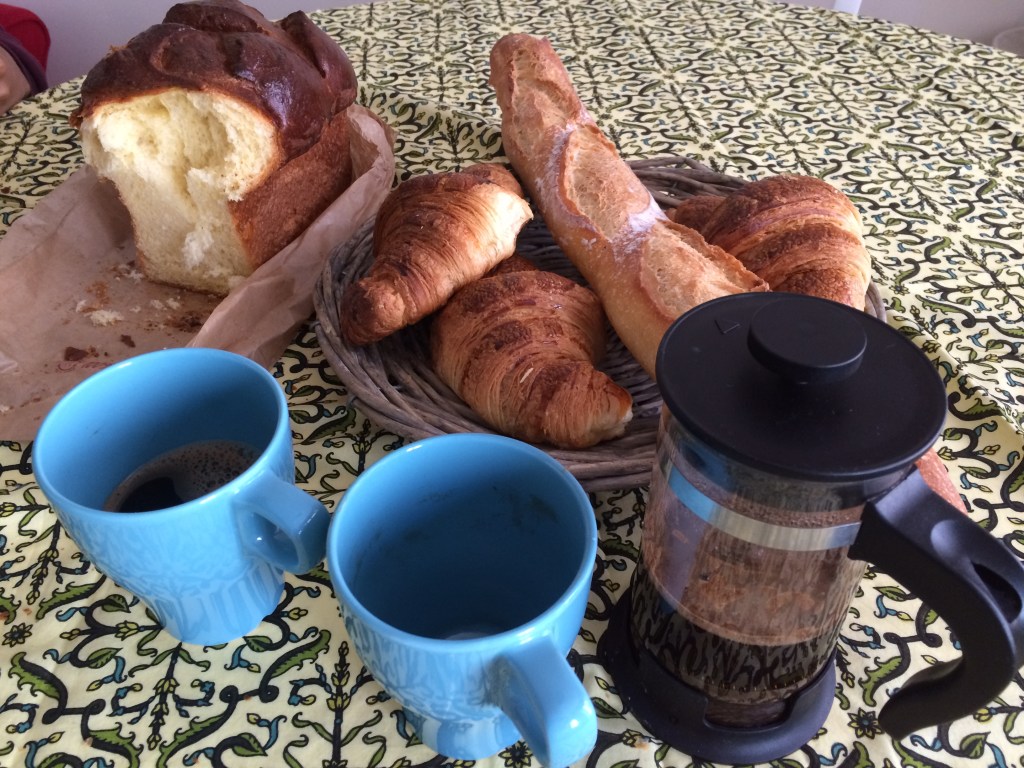 La mia giornata comincia SEMPRE con una bella colazione a base di caffè e croissant, che compro nella vicina boulangerie (la sera prima, così non devo uscire). Naturalmente in casa non manca mai una bella baguette, che spalmo con il burro normanno e le marmellate fatte in casa dalla mia amica Claire. Ogni tanto mi concedo anche una brioche: qui le fanno molto più grandi rispetto all’Italia, e sono super-soffici. Impossibile resistere!