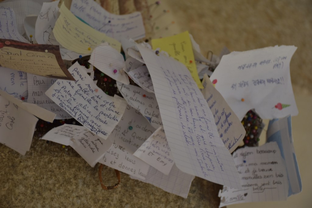 Quella che vedete qui sopra è la statua di Saint-Céneri, all’interno della cappella. Come potete notare, è ricoperta di spilli e bigliettini. La tradizione vuole che le giovani donne in cerca di marito debbano infilare un ago nella veste del santo. Se l’ago resta piantato nella pietra, il voto sarò esaudito entro l’anno. A giudicare dalla quantità di aghi, sembra proprio che siano in molti a crederci!