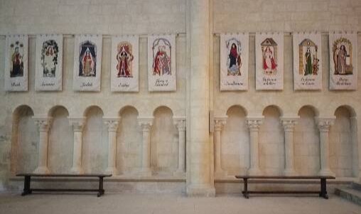 Arrivata nell’abside, mi trovo di fronte a un’opera dedicata alle donne. Si intitola “Prières de Femmes“, una serie di tele ricamate con il punto tradizionale della Tapisserie di Bayeux, realizzate nel 2000 dagli “Artigiani della Pace” su disegno di Brigitte Comby. Ci sono tutte le donne delle Sacre Scritture, da Ruth a Edith, Esther, Maria ed Elisabetta.
