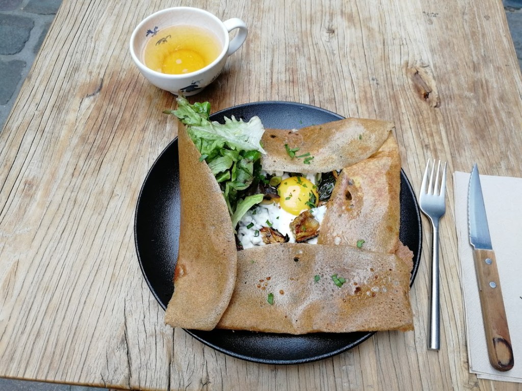 Ha pochissimi tavoli, quindi devo aspettare un po’. Ma ne vale davvero la pena! Lo chef (che poi mi dirà essere originario di Nanterre) mi propone la “crepe du jour”, che non è neanche nel menu visto che se l’è inventata sul momento: uovo, feta lavorata, zucchine, melanzane, cipollina fresca ed erbe varie. Una vera delizia per il palato e per il cuore. Il tutto accompagnato da una bolée di sidro, anche quello bio. Cosa c’è di meglio per ricaricarsi????