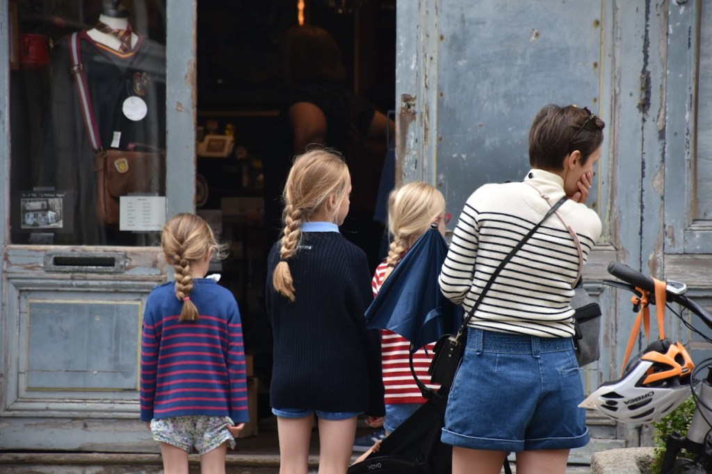 Non sono entrata, ma sono rimasta letteralmente ipnotizzata da queste tre ragazzine bionde pettinate allo stesso modo, i capelli raccolti in una treccia, accompagnate dalla mamma, anche lei con l’immancabile maglie a righe bretone.